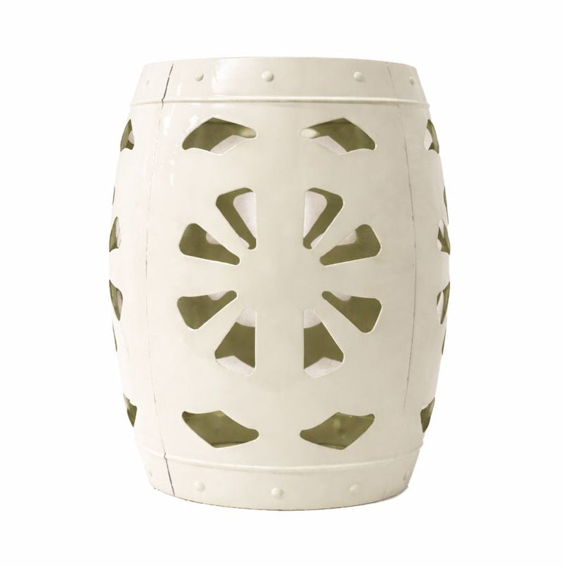 This outdoor plant stand combines function and style with a soft, neutral tone that blends naturally with patios, porches, and garden spaces. Decorative cutout patterns wrap around the sides, adding visual interest.