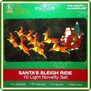 Enjoy a nice touch of nostalgia with these Kurt Adler Novelty Lights. 10-light Santa with his 8 reindeer. 12" Spacing between each character.