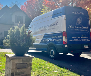 Early spring this year there was a knock on the door. A fellow from Simple and Grand was at the door picking up the winter plants as due to the warmer weather the pine needles were turning brown and falling off leaving needles on the front porch. He took the plants and swept off the needles from the porch, which was very nice. But then he did this - We have a glass Gnome on our front porch next to one of the planters. He was concerned that with all the wind we were having that that without the plant in the container, the wind would blow the container over and knock over and break the Gnome. So he handed to me for safe keeping until the spring plants were delivered. I was amazed.... We have been a subscriber for 2 years now and love the planters and the service!!